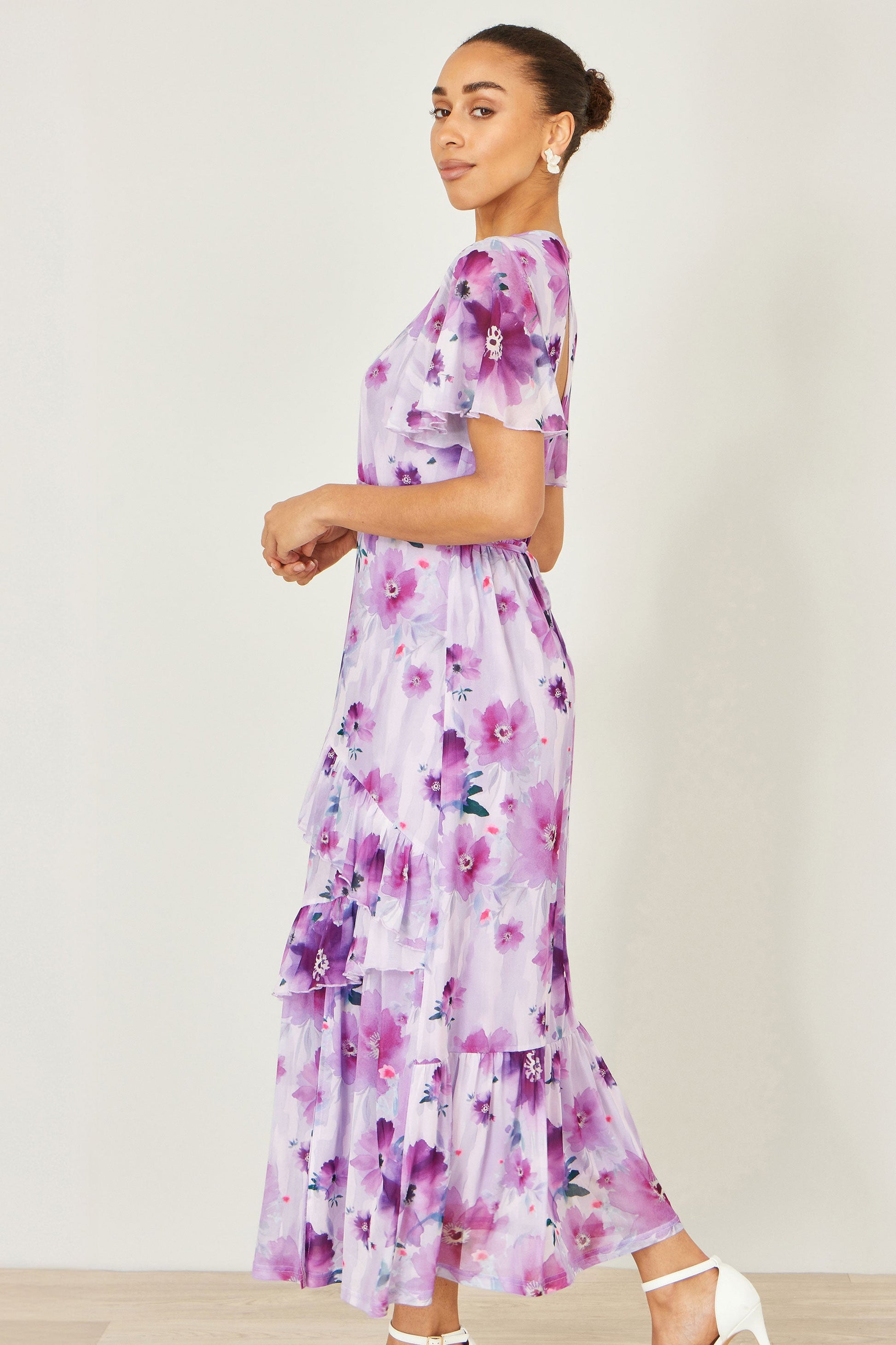 This elegant midi dress features a soft lavender base adorned with a delicate watercolour floral print in shades of purple and blush. Designed with a round neckline and airy short sleeves, it flatters the silhouette with a gently fitted bodice that flows into an asymmetric, tiered skirt. The lightweight, semi-sheer fabric creates beautiful movement, making it perfect for daytime events, garden parties, or special occasions where effortless elegance is key.